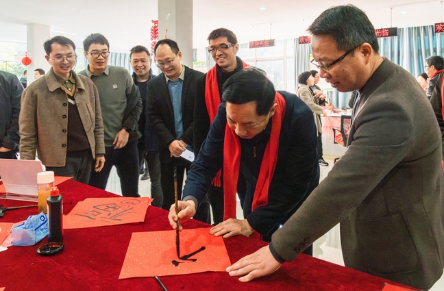 長桌一側(cè),紅紙翻飛,筆墨流轉(zhuǎn)。曾華平副書記走到案前,與同學們親切交流書法心得,并揮毫潑墨,寫下蒼勁有力的“福”字。他勉勵同學們要利用好假期時光,在傳承中華優(yōu)秀傳統(tǒng)文化中增強文化自信。各位領(lǐng)導(dǎo)老師也紛紛加入同學們的書寫行列,既有“丹鳳呈祥龍獻瑞”的豪邁,又有“紅梅含笑柳含煙”的雅致,一幅幅寓意吉祥的春聯(lián),承載著師生對新年的美好期許。