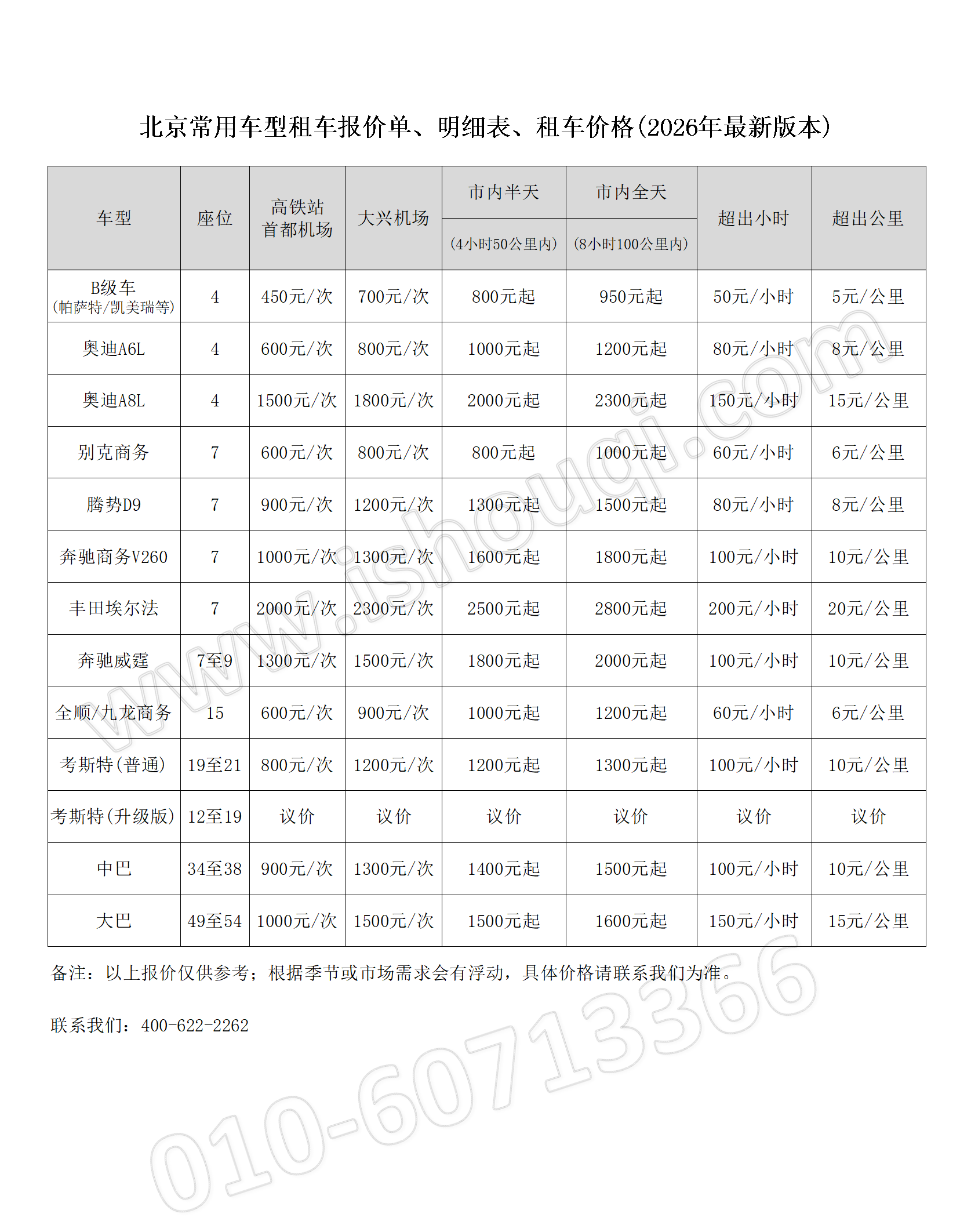 3.超出部分均按照雙超標(biāo)準(zhǔn)收取,北京周邊旅游包車、大型會(huì)議租車,需根據(jù)實(shí)際用車情況來制定方案;